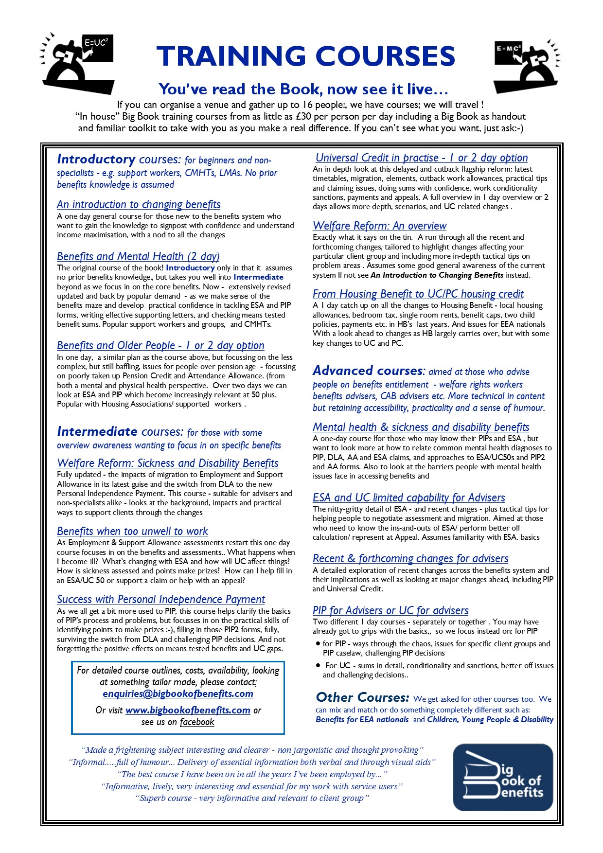 The Big Book of Benefits and Mental Health began from practical handouts for a 2 day training course for a CMHT in South Wales. And we are delighted to have relaunch an updated version of the very same two day Benefits and Mental Health course, by request of a mental health support group. You can find out more about this course and other courses – with or without a mental health bias – under our Training page