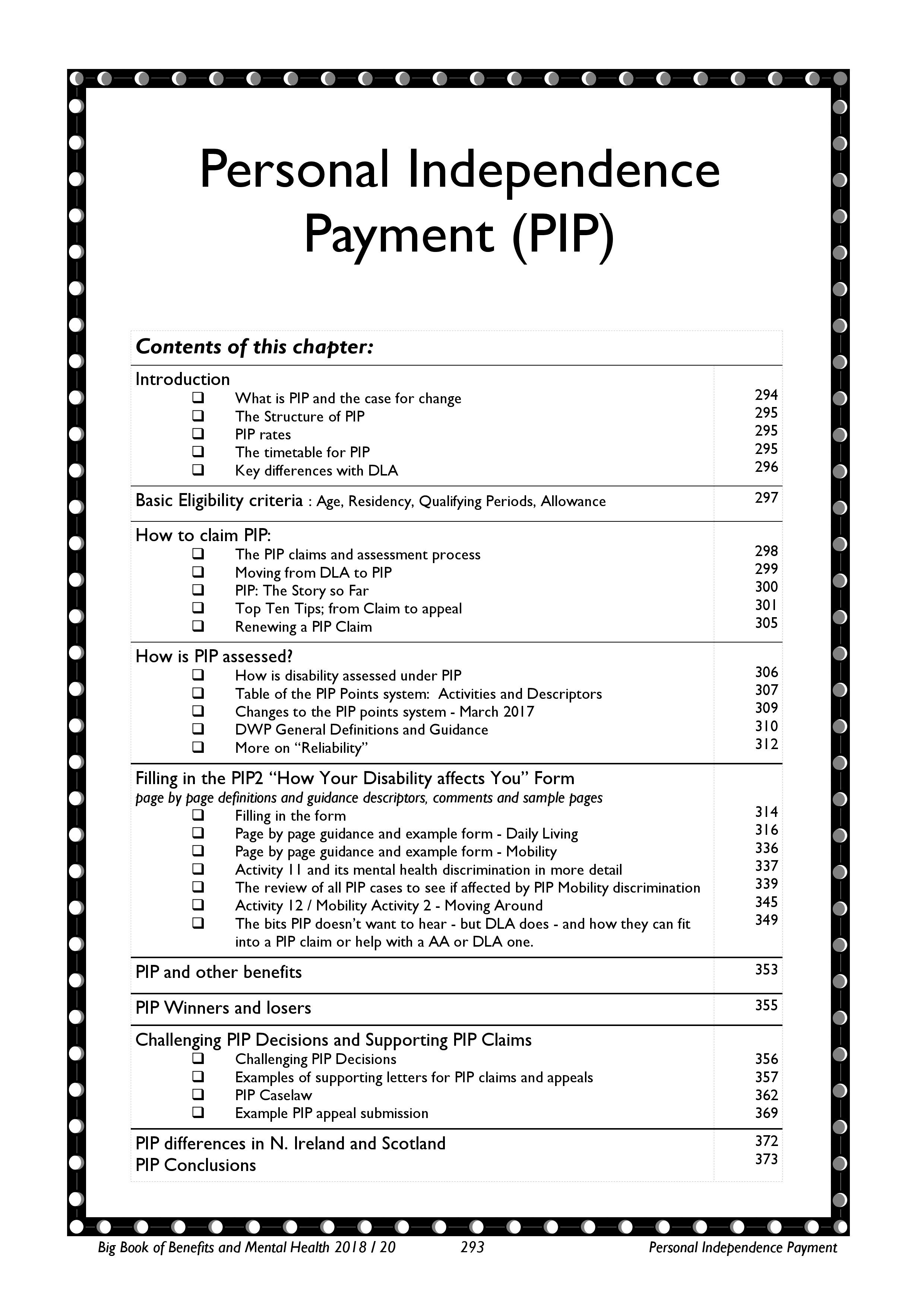 - updated and expanded coverage of Personal Independence Payment (PIP) – updated for the March 2017 changes to the points system, with a new handy summary of the old and new systems with handy definitions on the back. Some updated guidance around the activities affected, especially the now overt discrimination against mental health within PIP Mobility. A revised example form to fit the new look PIP How Your disability Affects You form . These join the practical tools: page by page guidance on filling in forms, example supporting letters, appeals submissions, updated caselaw and a guide to common DLA and PIP related difficulties linked to mental health diagnoses. We include details of mitigations in N.Ireland and will keep an eye on what Scotland chooses to do with its newly acquired control with PIP.